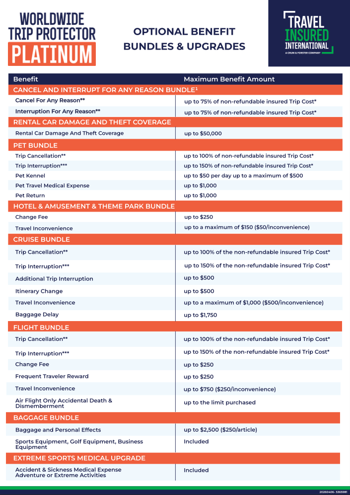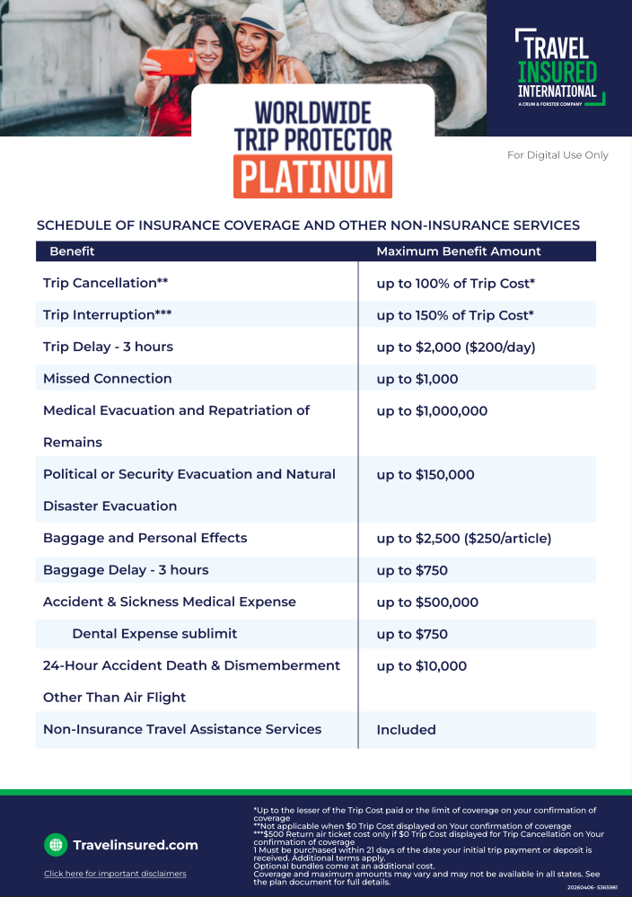 Below, you can review the travel protection benefits offered through our partner, Travel Insured International.